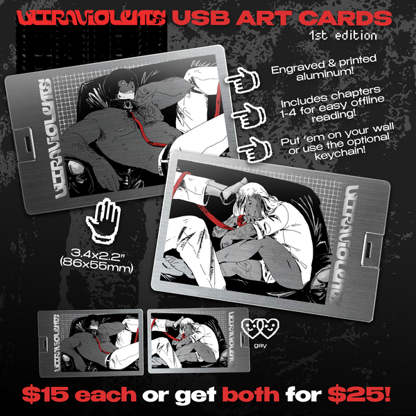 Out of space on your bookshelf for more comics? Get a USB art card! 3.4x2.2" (86x55mm) aluminum with etched AND screenprinted designs of the main characters of my webcomic Ultraviolents. Thin enough to be put in a frame or hang 'em with an included small key strap!